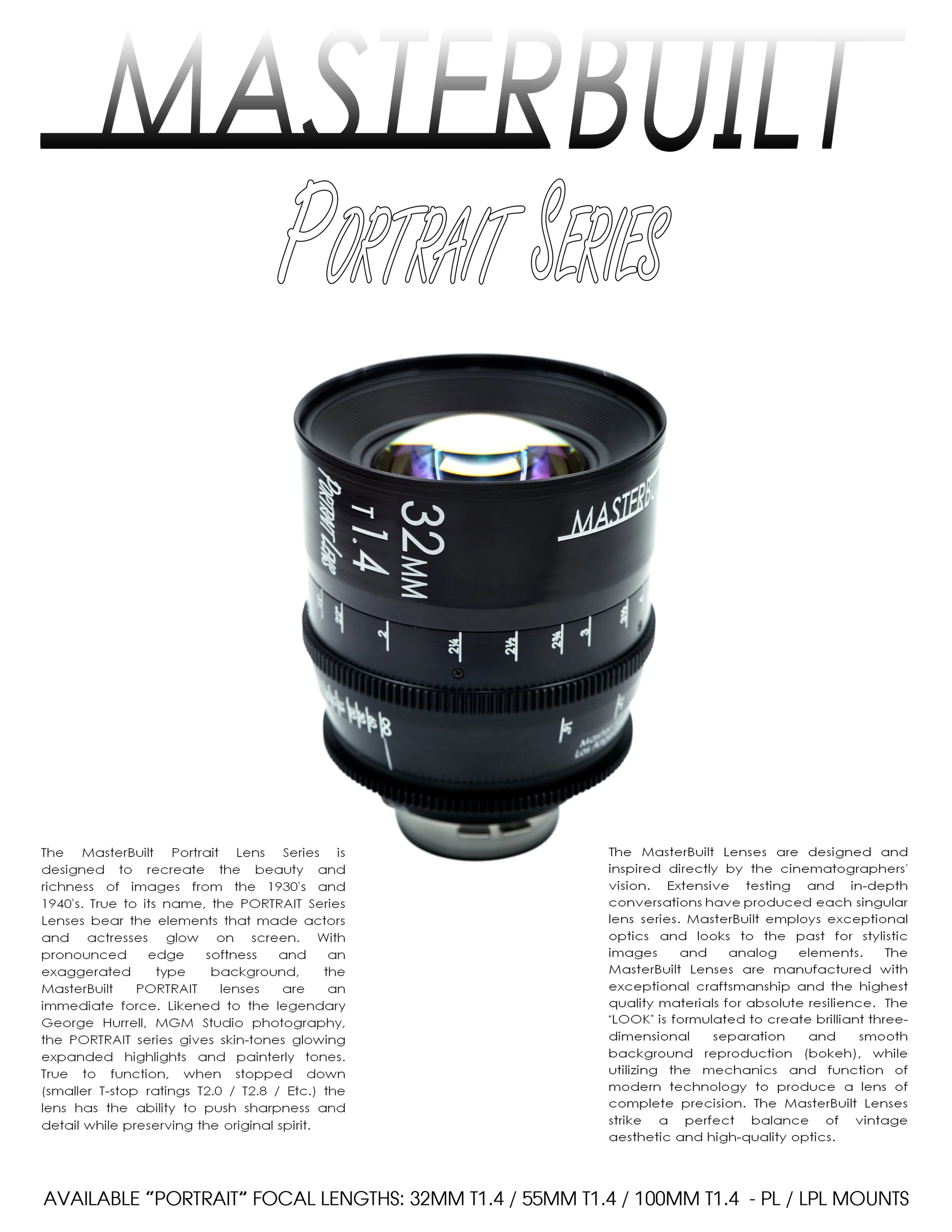 The MasterBuilt Portrait Lens Series is designed to recreate the beauty and richness of images from the 1930’s and 1940’s. True to its name, the 100MM T1.4 Portrait Lens bears the elements that made actors and actresses glow on screen. With pronounced edge softness and a “swirly” - PETZVAL type background, the MasterBuilt PortraitLens is an immediate force. Likened to the legendary George Hurrell MGM Studio photography, the Portrait series gives skin-tones glowing expanded highlights and painterly tones. True to function, when stopped down (smaller F-stop ratings) the lens has the ability to push sharpness and detail to outstanding quality while preserving the original spirit.